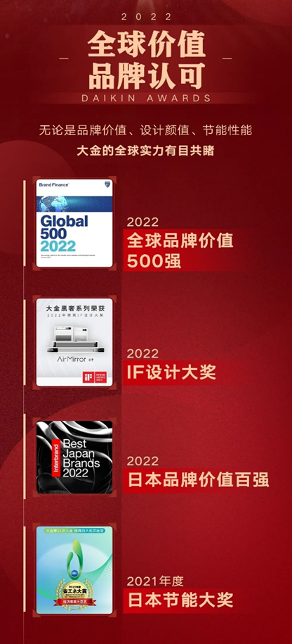 无论是全球品牌价值500强、德国iF设计大奖、还是日本最具价值100品牌, ECCJ日本节能大奖,大金的全球实力有目共睹。