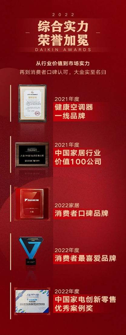 健康空调器一线品牌、中国家居行业价值100公司、家居消费者口碑品牌、消费者最喜爱品牌、中国家电创新零售优秀案例奖等奖项,见证大金强大的综合实力。