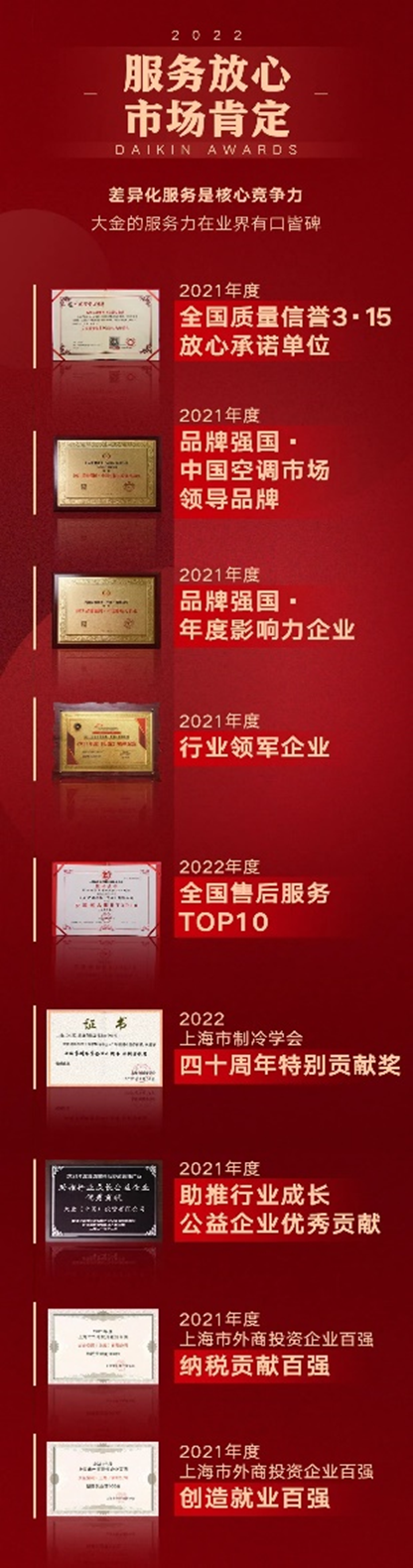 全国质量信誉3·15放心承诺单位、品牌强国·中国空调市场领导品牌/年度影响力企业/(行业)领军企业,以及全国售后服务TOP10……差异化服务是核心竞争力,大金的服务力在业界有口皆碑。