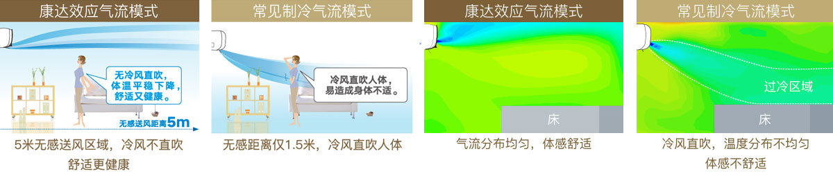 制冷时开启康达效应气流,在房间内形成长达5米的无感送风区域,气流更高更远,室内温度均匀舒适。