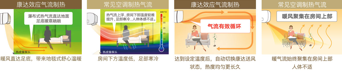 制热时开启康达效应气流,暖气流更广、更集中地向地板区域输送,同时均匀温度,体感舒适更持久。